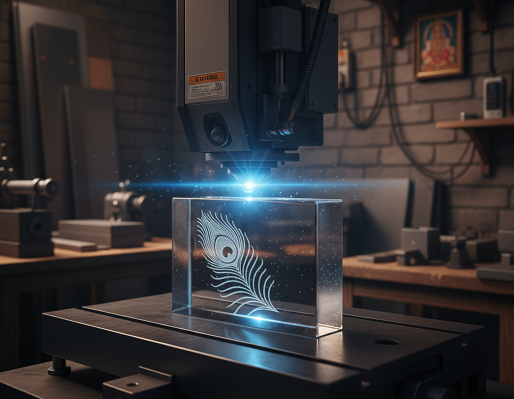Sub-surface 2D and 3D laser engraving inside crystal cubes and glass blocks, capturing lifelike images, text, and designs.