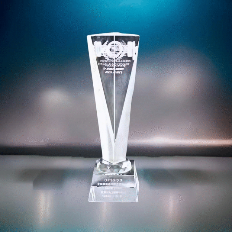 Custom-designed trophies and awards in crystal, acrylic, and metal with engraved details.